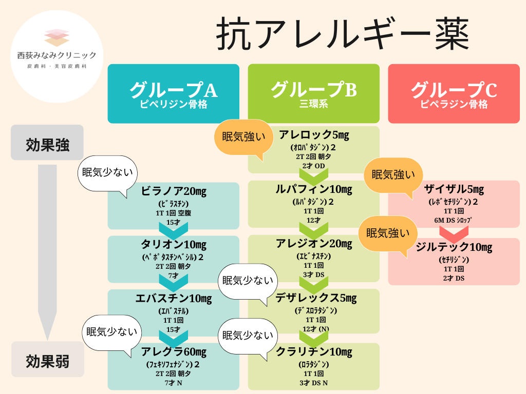 当院では、下記のようなお薬の表を使って、それぞれの患者様にあったお薬を丁寧にご説明し処方しております。